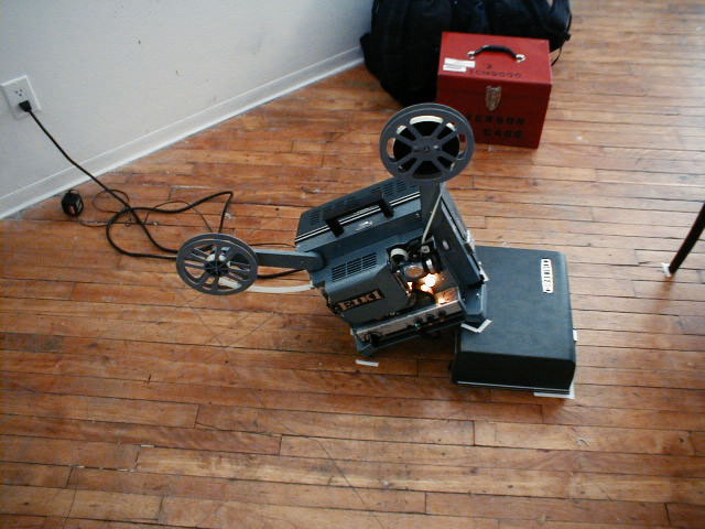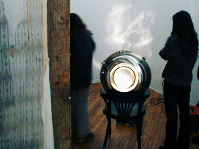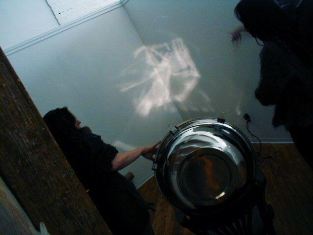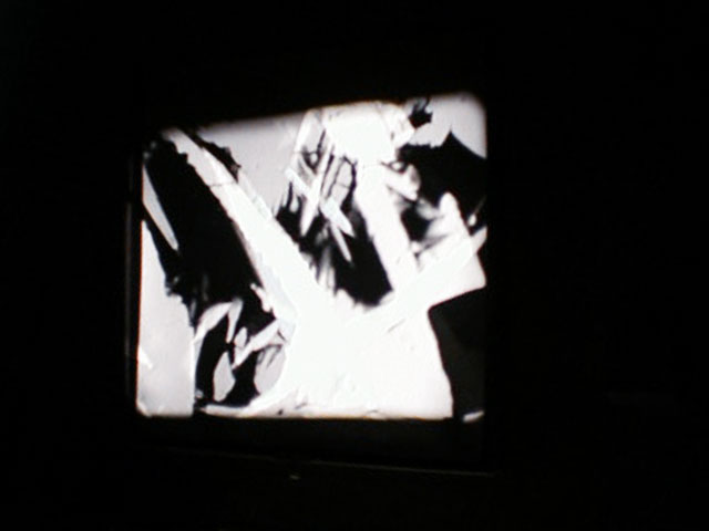An experimental group installation involving a 16mm film projector, metal bowl and hand-processed 16mm B&W film.